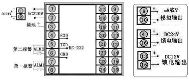 输出方式 | 01234567 | 无控制输出继电器触点电流 4~20mA电流 0~10mA电压 1~5V电压 0~5VSCR-过零触发脉冲SSR-固态继电器 | |||||||||