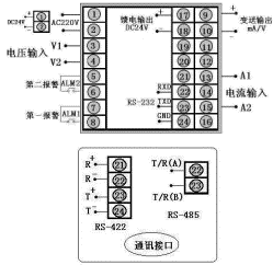 交流电压表,输入类型为0~5A,继电器控制输出,带RS-485通讯,带上限继电器报警输出,带DC24V馈电输出。