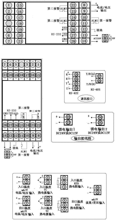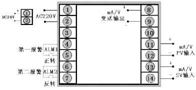输出方式为继电器正反转输出,PV输入类型为4~20 mA,SV输入类型1~5 V,DC24V供电。