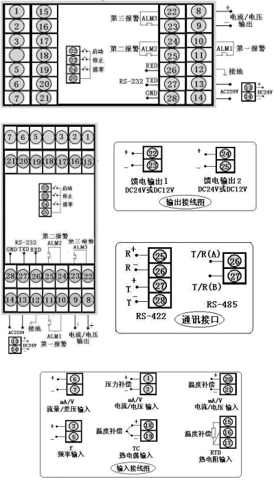 流量积算仪,无补偿输入,通讯方式为RS-232,输出方式为继电器输入,流量输入类型为4 ~ 20 mA,第一报警为上限报警,第二报警为下限报警,DC24V馈电输出,DC24V供电,竖表。
