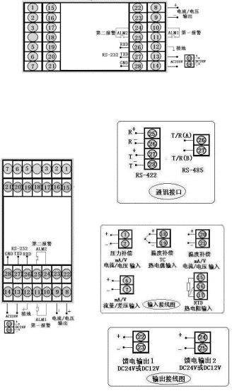 带补偿输入,通讯方式RS-232,输出方式为继电器输出,输入类型为第一路0~10 mA,第二路1~5V,第一报警为上限报警,第二报警为下限报警,单路DC24V馈电输出,DC24V供电,竖表。